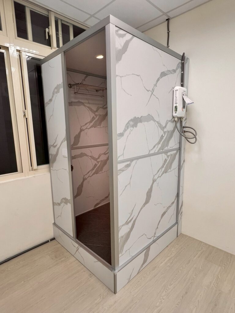 HAA054 | 和平東路一段快客整體衛浴案例 YO2025 年 8 月 29 日新增整體浴室 施作說明及照片 詳細資訊 項目內容關鍵字施作年份2025施作類型新增整體浴室 板材類型 石尚系列 板材顏色白色大理石紋 底座支架浩克系列-塑鋼 地板面材灰色石紋919 外觀形狀方形 施作地點室內 門片選擇塑鋼門內開 施作用途一般家用 衛浴設備沐浴龍頭 掛件五金 附加工程無其他設備瞬熱式電熱水器 無障礙設備無備註